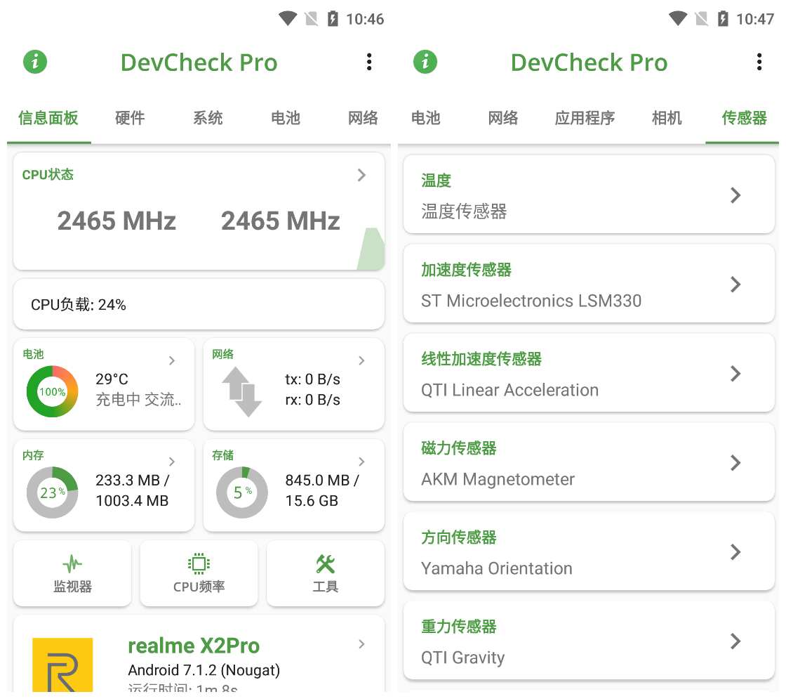 DevCheck Pro是一款可以帮助您显示需要了解的有关安卓设备,硬件和操作系统的所有信息;专业版具有实时系统监视功能,具有完全可调的半透明浮动窗口以及主题选项;如果您想对您手机的硬件信息检测,您可以下载DevCheck使用哦。