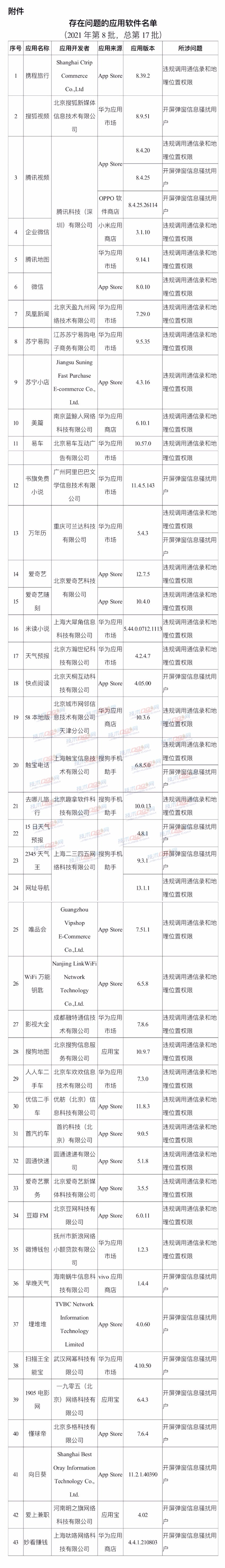 在名单的应用软件包含微信、腾讯视频、爱奇艺、携程旅行、企业微信、腾讯地图、搜狐视频等